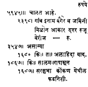 यादा चिंतो विठ्ठल सु॥ समान सबैन मया व अलफ. तैनात सालिना रु. ३०००० पे॥ नाडगौडेपणाचे वतनाचे ऐवजी वजा रु. ७८०० बाकी तैनात सालिना करार २२२०० रुपये.